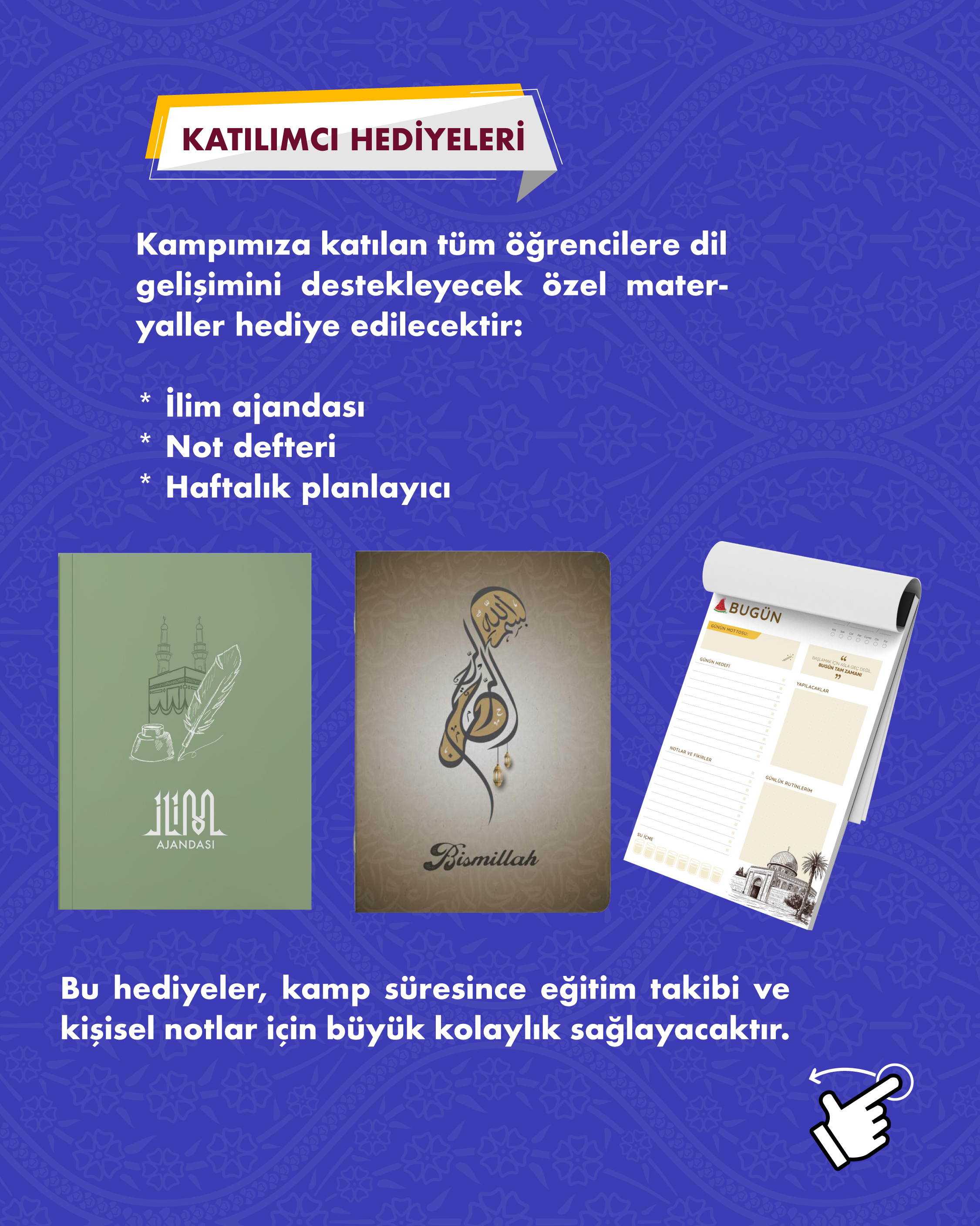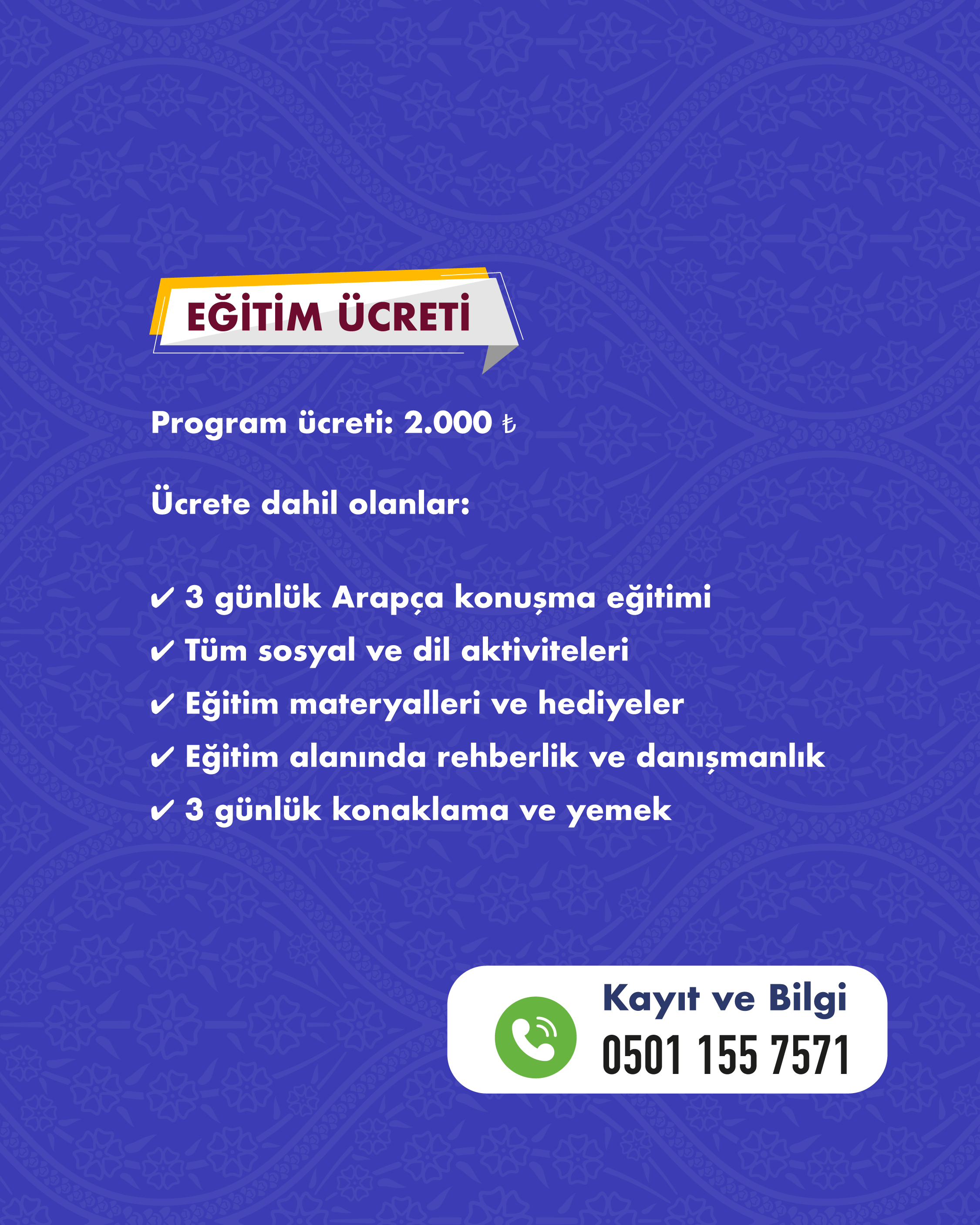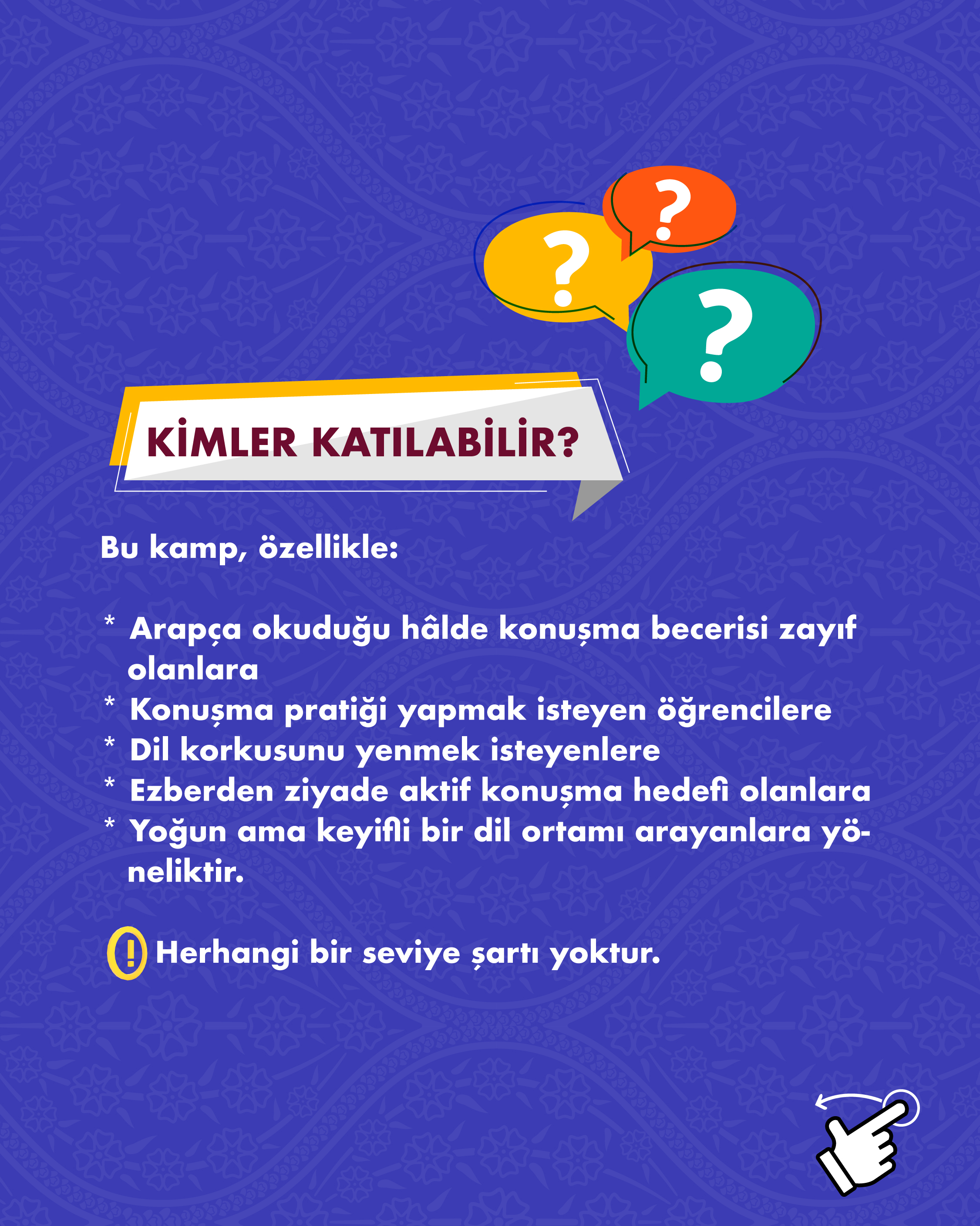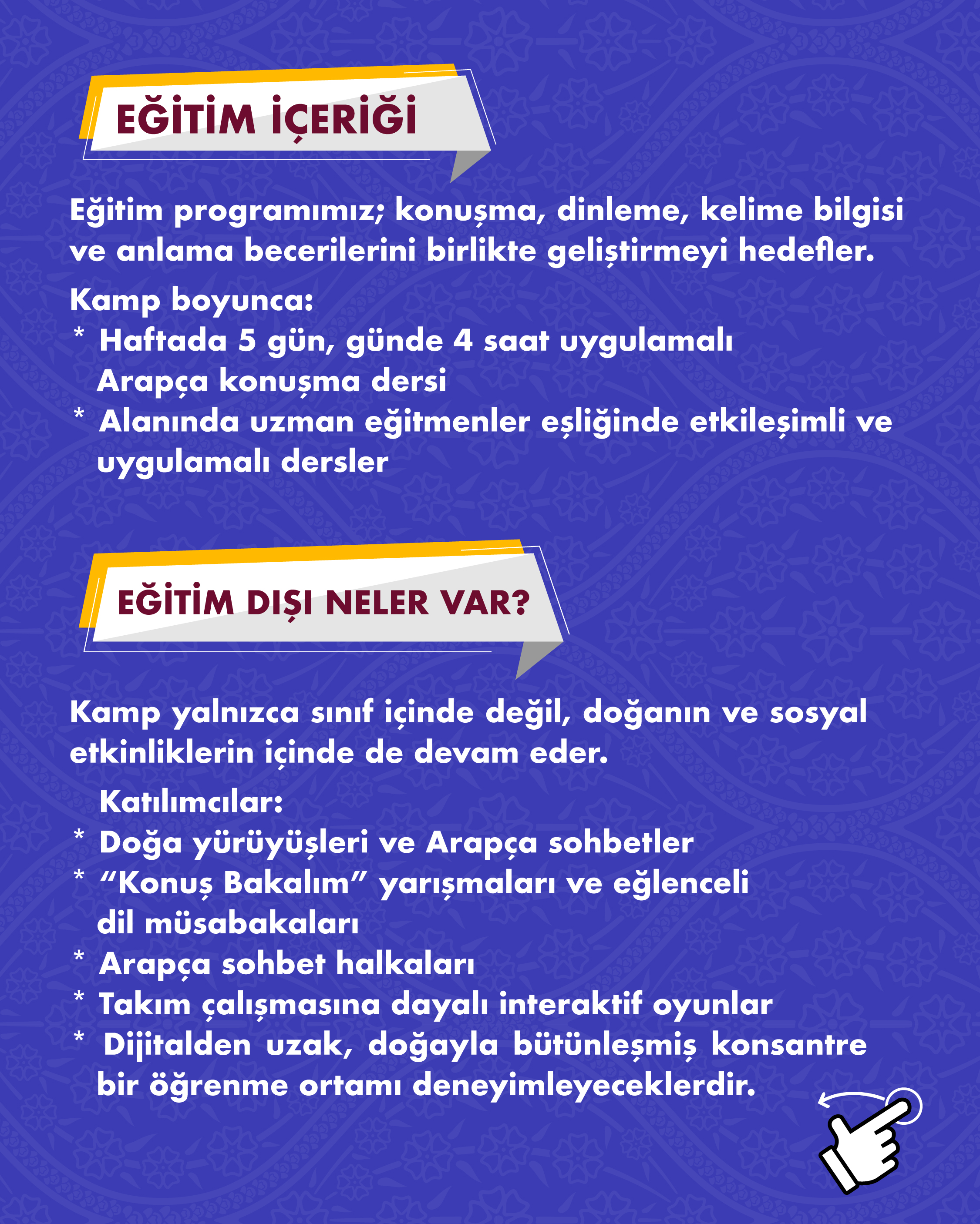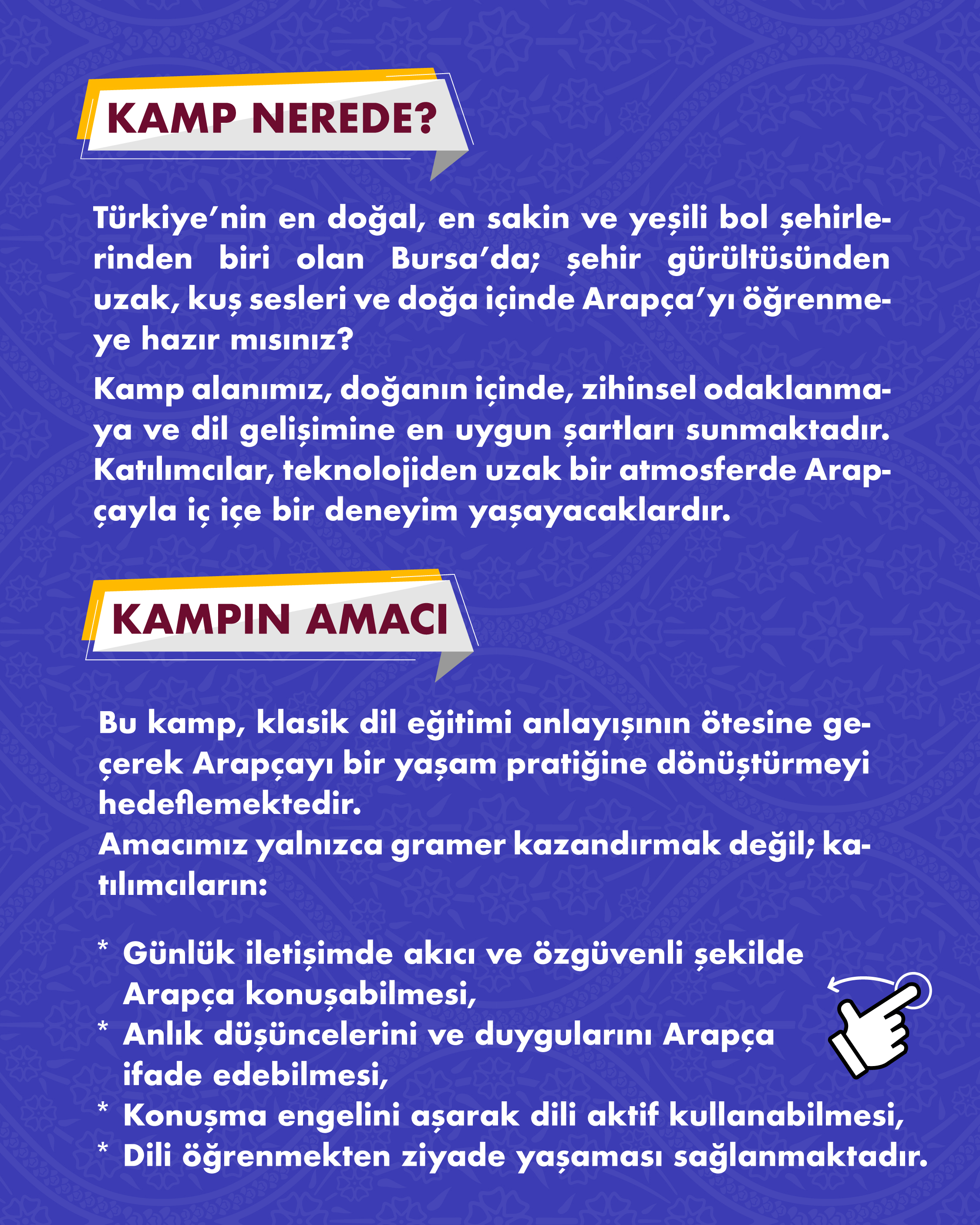 Şehirden uzak, doğanın içinde; Arapçayı sadece öğrenmek değil aktif şekilde konuşmak ve yaşamak isteyen hanımefendiler için hazırlanan bu kamp, yoğun ve uygulamalı bir konuşma programıdır. Kamp süresince katılımcılar; uzman eğitmenler eşliğinde yapılacak dersler, sosyal etkinlikler ve interaktif çalışmalarla Arapça konuşma becerilerini geliştirecek, dil korkusunu aşarak Arapçayı günlük hayatın doğal bir parçası hâline getirme imkânı bulacaktır.