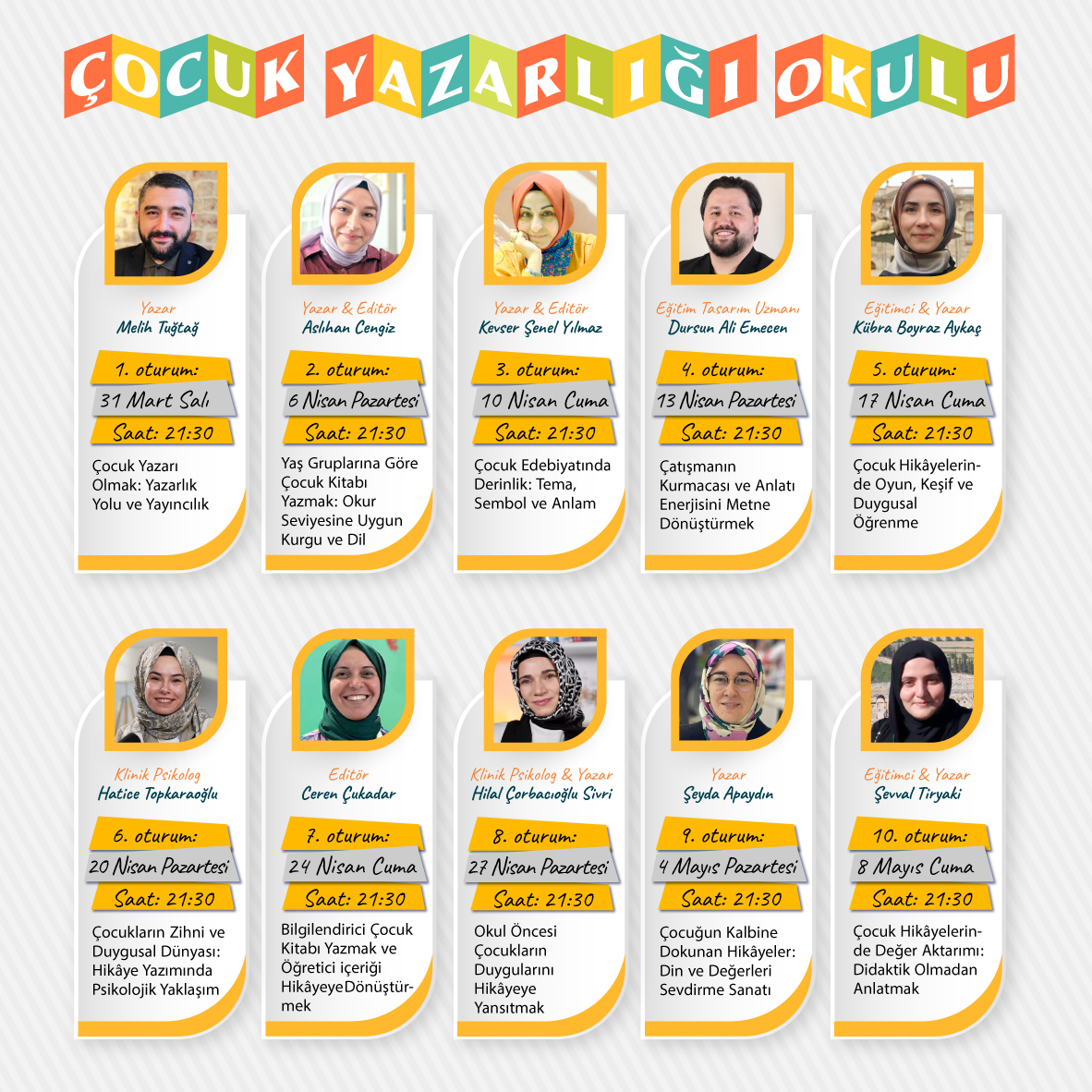 Hayal gücünün kelimelere dönüştüğü, çocukların dünyasına dokunan hikâyelerin nasıl inşa edildiğini keşfetmeye davet eden Çocuk Yazarlığı Okulu; çocuk edebiyatını çok yönlü ele alan özel bir eğitim programıdır. Mart–Mayıs döneminde çevrim içi olarak gerçekleştirilecek bu seri; 🔸 10 oturum 🔸 Alanında uzman 10 eğitmen 🔸 Çocuk edebiyatına dair zengin içerik ile yazarlık yolculuğunuza derinlikli bir bakış sunuyor. 📚 Konu Başlıkları, Eğitmenler, Eğitim Tarihleri ve Saat: 1) Çocuk Yazarı Olmak: Yazarlık Yolu ve Yayıncılık – Yazar Melih Tuğtağ – 31 Mart Salı, 21.30 2) Yaş Gruplarına Göre Çocuk Kitabı Yazmak: Okur Seviyesine Uygun Kurgu ve Dil – Yazar & Editör Aslıhan Cengiz – 6 Nisan Pazartesi, 21.30 3) Çocuk Edebiyatında Derinlik: Tema, Sembol ve Anlam – Yazar & Editör Kevser Şenel Yılmaz – 10 Nisan Cuma, 21.30 4) Çatışmanın Kurmacası ve Anlatı Enerjisini Metne Dönüştürmek – Eğitim Tasarım Uzmanı DursunAli Emecen – 13 Nisan Pazartesi, 21.30 5) Çocuk Hikâyelerinde Oyun, Keşif ve Duygusal Öğrenme – Eğitimci & Yazar Kübra Boyraz Aykaç – 17 Nisan Cuma, 21.30 6) Çocukların Zihni ve Duygusal Dünyası: Hikâye Yazımında Psikolojik Yaklaşım – Klinik Psikolog Hatice Topkaraoğlu – 20 Nisan Pazartesi, 21.30 7) Bilgilendirici Çocuk Kitabı Yazmak ve Öğretici İçeriği Hikâyeye Dönüştürmek – Editör Ceren Çukadar – 24 Nisan Cuma, 21.30 8) Okul Öncesi Çocukların Duygularını Hikâyeye Yansıtmak – Klinik Psikolog & Yazar Hilal Çorbacıoğlu Sivri – 27 Nisan Pazartesi, 21.30 9) Çocuğun Kalbine Dokunan Hikâyeler: Din ve Değerleri Sevdirme Sanatı – Yazar Şeyda Apaydın – 4 Mayıs Pazartesi, 21.30 10)Çocuk Hikâyelerinde Değer Aktarımı: Didaktik Olmadan Anlatmak – Eğitimci & Yazar Şevval Tiryaki – 8 Mayıs Cuma, 21.30 Eğitim Süresi: 10 Oturum Çocuk Yazarlığı Okulu; çocukların kalbine dokunan, anlamlı ve etkili hikâyeler yazmak isteyenlere hem ilham verici hem de yol gösterici bir öğrenme alanı sunuyor. 🎓 Program sertifikalıdır. ⚠️ Sınırlı kontenjan! 🌿 Sen de çocukların dünyasına dokunan hikâyeler yazmak için bu yolculuğa katıl!