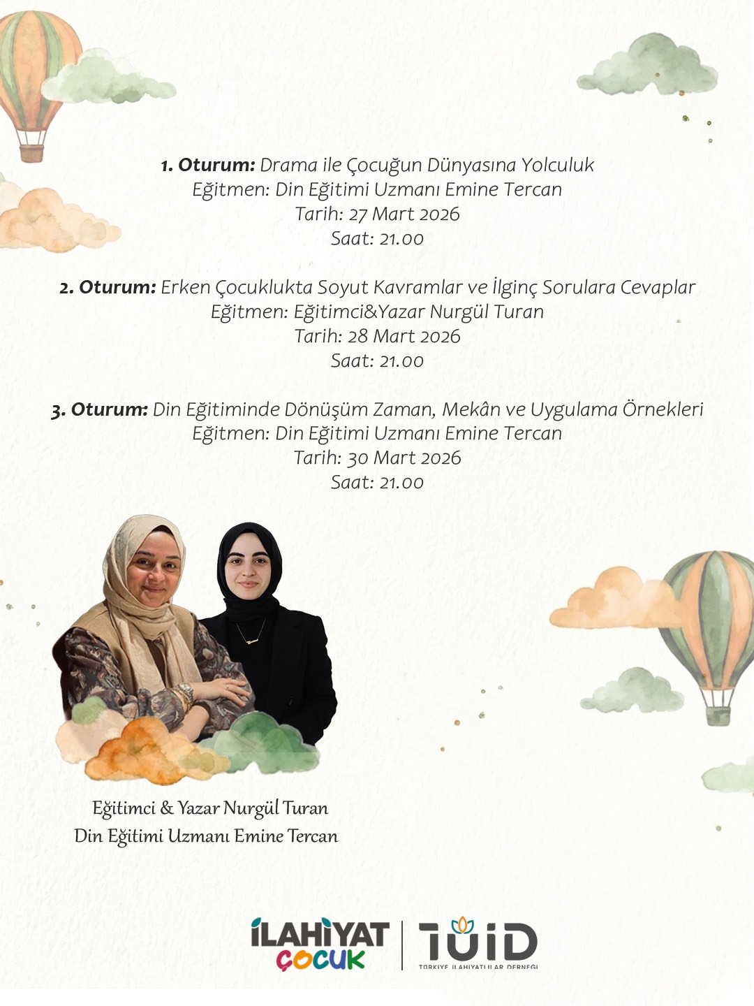 Çocukların dünyasını anlayabilmek, onların bakış açısını fark etmek ve eğitim sürecini bu perspektiften şekillendirmek, nitelikli bir din eğitiminin en önemli adımlarından biridir. Çocuk merkezli bir yaklaşım; yalnızca bilgiyi aktarmayı değil, çocuğun anlam dünyasını, gelişim özelliklerini ve deneyimlerini dikkate alarak öğrenme sürecini zenginleştirmeyi amaçlar. “Çocukla Aynı Yerden Bakmak: Din Eğitiminde Anlam ve Deneyim Atölyesi”, çocuklarla çalışan eğitimcilere ve bu alana ilgi duyanlara yönelik olarak hazırlanmış uygulama temelli bir eğitim programıdır. Atölyede, erken çocukluk döneminde din eğitiminin nasıl daha anlamlı ve etkili hale getirilebileceği; çocuğun gelişim dünyası, öğrenme biçimleri ve merak ettiği sorular üzerinden ele alınacaktır. Program kapsamında katılımcılar; çocukların soyut kavramları nasıl algıladığını, merak ettikleri sorulara nasıl yaklaşılması gerektiğini ve din eğitiminde deneyim temelli yöntemlerin nasıl kullanılabileceğini örnek uygulamalarla keşfedeceklerdir. Özellikle drama, deneyimsel öğrenme ve pedagojik yöntemler üzerinden din eğitiminin daha canlı, anlaşılır ve kalıcı hale gelmesi üzerinde durulacaktır. Atölye süresince katılımcılar yalnızca teorik bilgiler edinmekle kalmayacak; aynı zamanda uygulama örnekleri ve yöntem önerileriyle kendi eğitim süreçlerine doğrudan katkı sağlayabilecek pratik yaklaşımlar da kazanacaklardır. Atölye İçeriği: - Drama yoluyla çocuğun dünyasını anlamaya yönelik yöntemler - Erken çocukluk döneminde soyut kavramların öğretimi - Çocukların merak ettiği sorulara pedagojik yaklaşımlar - Din eğitiminde zaman, mekân ve deneyim temelli öğrenme - Uygulama örnekleri ve etkili öğretim yöntemleri Oturumlar: 1. Oturum – Drama ile Çocuğun Dünyasına Yolculuk Eğitmen: Din Eğitimi Uzmanı Emine Tercan Tarih: 27 Mart 2026 Saat: 21.00 2. Oturum – Erken Çocuklukta Soyut Kavramlar ve İlginç Sorulara Cevaplar Eğitmen: Eğitimci & Yazar Nurgül Turan Tarih: 28 Mart 2026 Saat: 21.00 3. Oturum – Din Eğitiminde Dönüşüm: Zaman, Mekân ve Uygulama Örnekleri Eğitmen: Din Eğitimi Uzmanı Emine Tercan Tarih: 30 Mart 2026 Saat: 21.00 Eğitmenler: Din Eğitimi Uzmanı Emine Tercan Eğitimci & YazarNurgül Turan